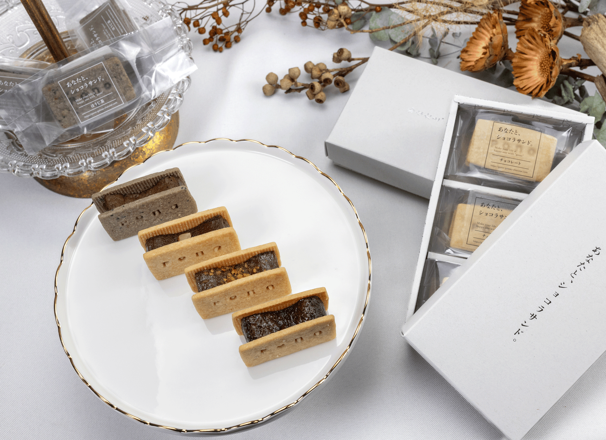 〇 鹿児島県産茶葉を使用したグルテンフリーのほうじ茶と抹茶ガトーショコラ。ほうじ茶と抹茶の豊かな香りが広がり、お茶の風味を贅沢に楽しめる一品です。また、ほうじ茶サンドは黒ごまのビスケットでサンドしているため、ごまとほうじ茶の香りが口の中に広がります。